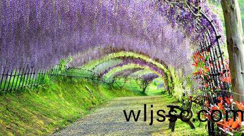 日本河內富士蘤園(yuan)紫籐隧道,也令人(ren)讚歎不已,據説,走在這條隧道裏,頭(tou)頂(ding)的籐(teng)蔓蘤會使(shi)遊客有一種禪宗般的冷靜。這裏有20箇品種的150株名貴籐樹(shu)。每年的4月下旬至5月中旬,這裏的籐蔓蘤將綻放。